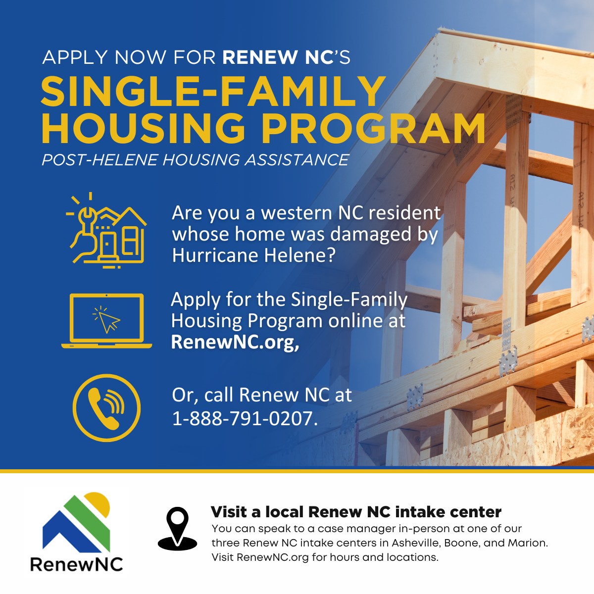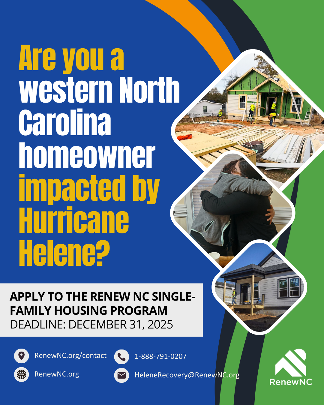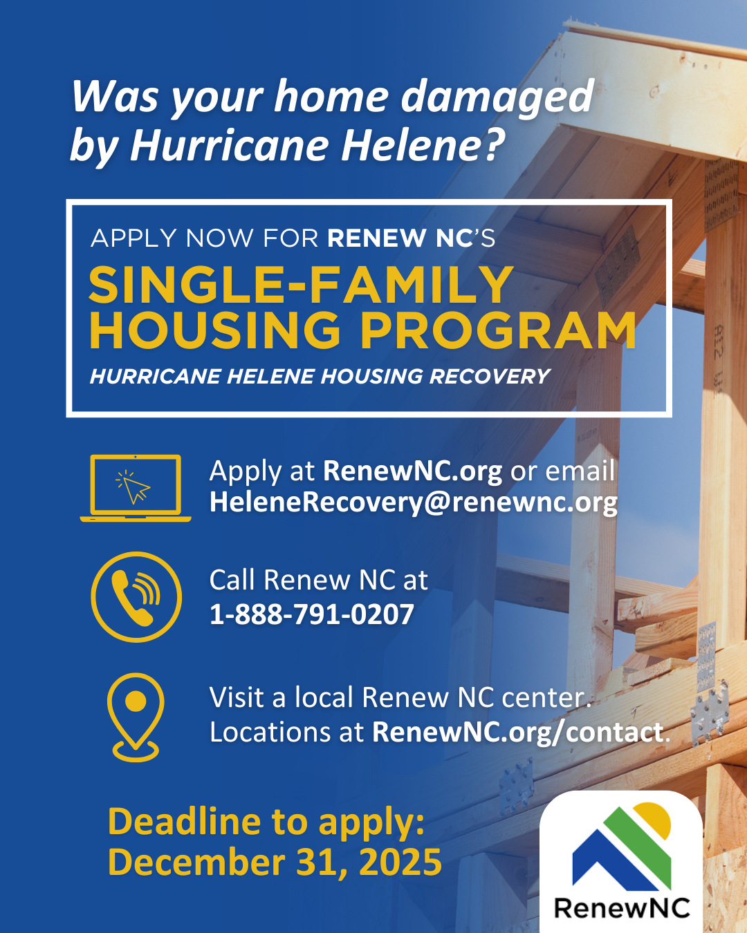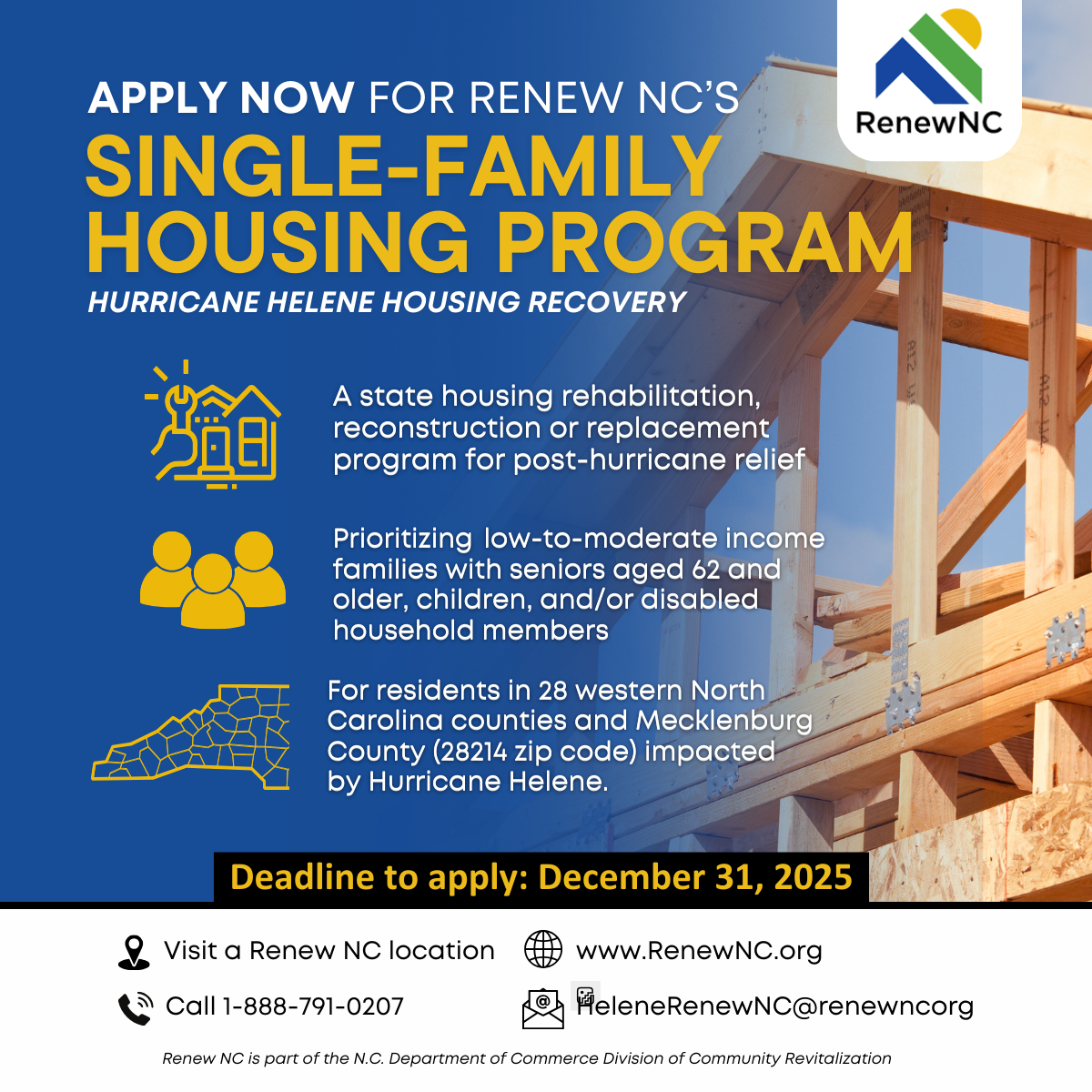 Renew NC, the stateβs long-term disaster relief initiative, is providing housing recovery assistance to Helene survivors. Homeowners in 28 western NC counties and one zip code (28214 in Mecklenburg County) are eligible to apply to the Renew NC Single-Family Housing Program and can get help with the costs of repairing, rebuilding, or replacing a home damaged by Helene. The deadline to apply is Dec. 31, 2025.