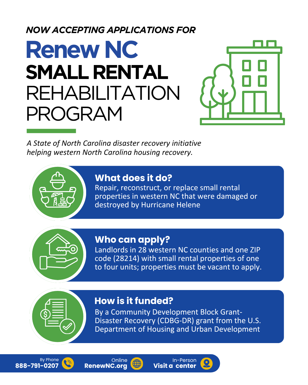 The Renew NC Small Rental Rehabilitation Program helps eligible rental property owners (landlords) in 28 western North Carolina counties and zip code 28214 in Mecklenburg County repair, reconstruct, or replace small rental properties (1–4 units) damaged by Hurricane Helene.